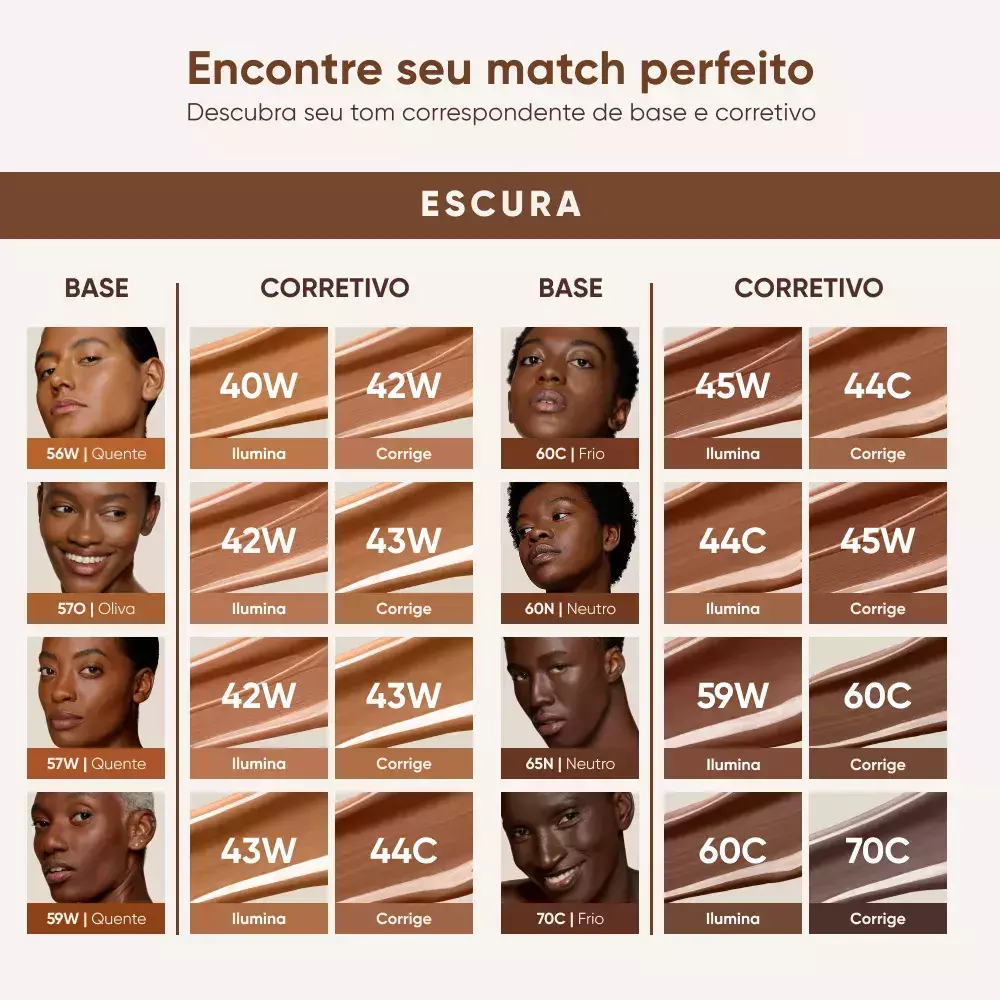 A cartela é composta por 24 tons, desenvolvidos para atender os 5 fototipos de pele e 3 subtons, com efeito suavizante e iluminador. Contém 2 tons neutralizadores, ideais para disfarçar olheiras e manchas escuras.
